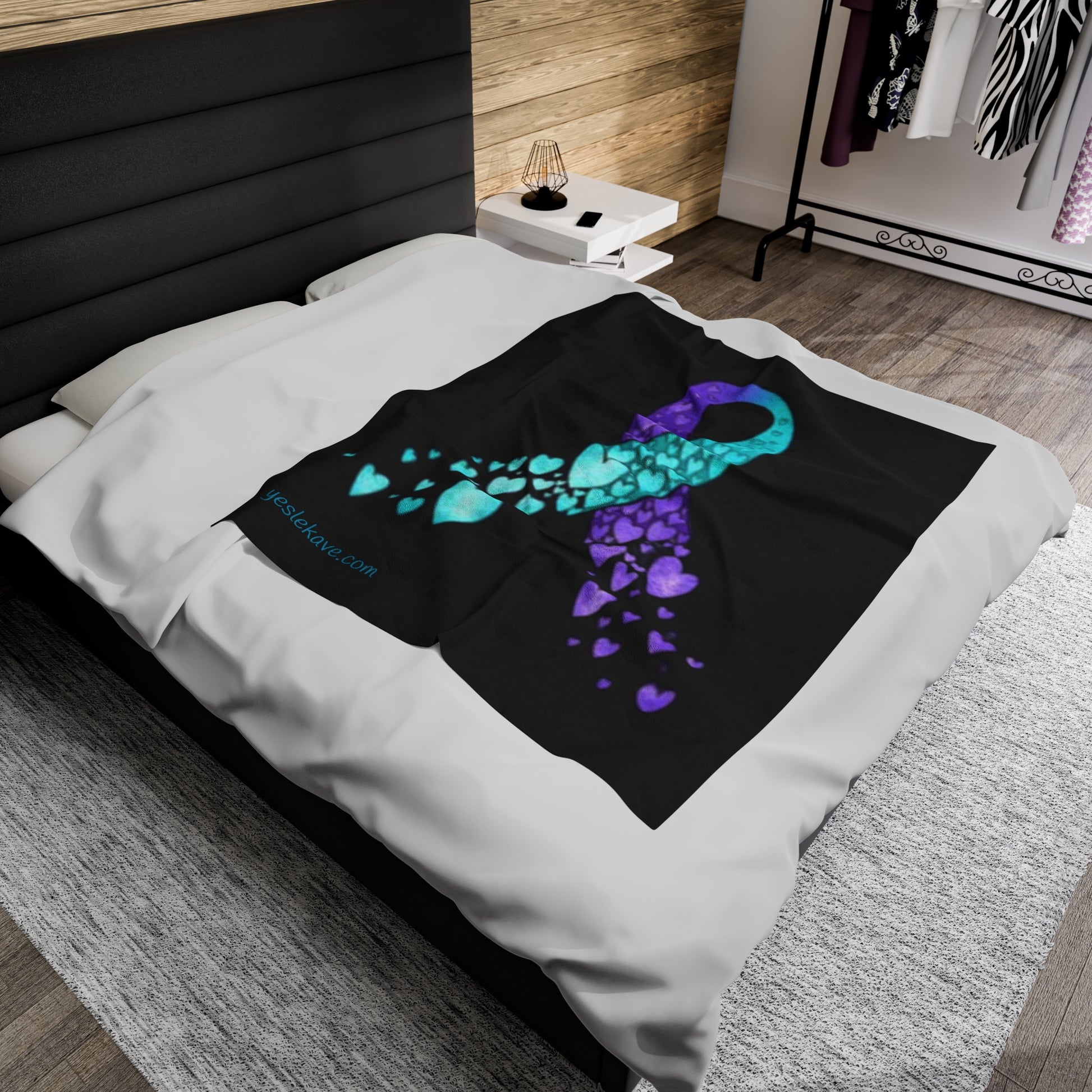 Create a cozy and warm atmosphere at home with this plush velveteen blanket. It is soft to touch and perfect for any home. Featured image of a suicide awareness heart ribbon print. Available in three sizes: 30x40", 50x60", 60x80".